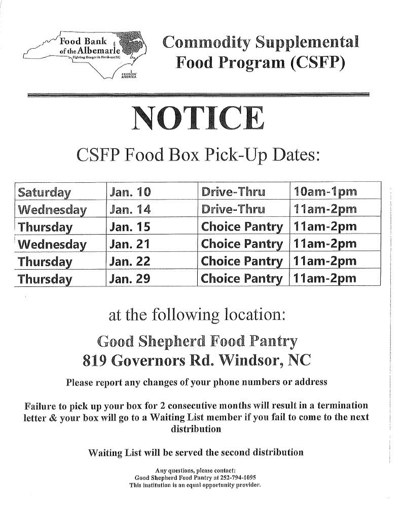 The Mission of the Good Shepherd Food Pantry is to increase self-reliance, relieve hunger and improve the quality of life for Bertie County Families.
